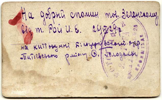 «На добрый спомин тов. Зеленскому, вiд т. Рой И. Е. 27 VII29 р.