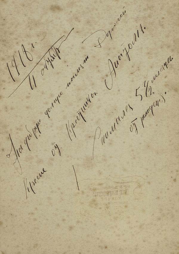 «1918 г. 11 октябрНа добрую долгую памят Дорогой Крест от Крестника Анатолiя.Снимался 5 1/2 месяцев от рожденiя.»(Фотография предназначалась Разумовой Анне Ивановне,крестник – Анатолий Фобер)