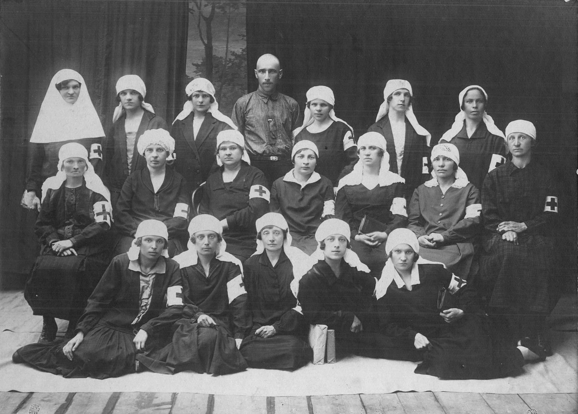 Фотография «Энергия» (А. Г. Шувалов, И. А. Никифоров, С. Э. Шапиро)Выпуск курса сестер милосердия в г. Рыбинске, б/д(в верхнем ряду вторая справа – Анна Ивановна Разумова)