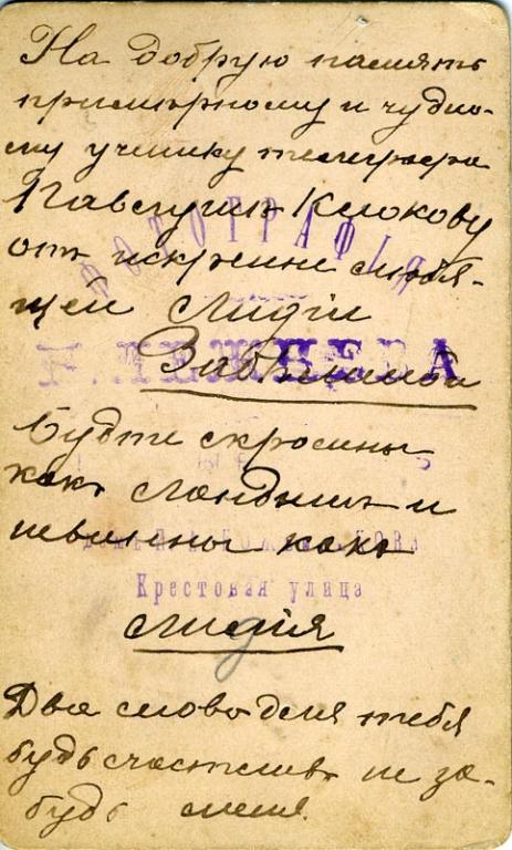«На добрую память примѣрному и чудному ученику ... Павлушѣ Клокову отъ искренне любящей Лидiи Забѣлиной
