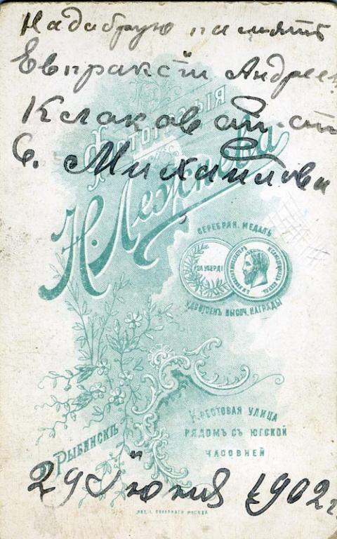 «На добрую память Евпраксiи Андрее(внѣ – А. М.) Клоковойот(ъ – А. М.) С. Михайлова29 Ïюня 1902 г.»