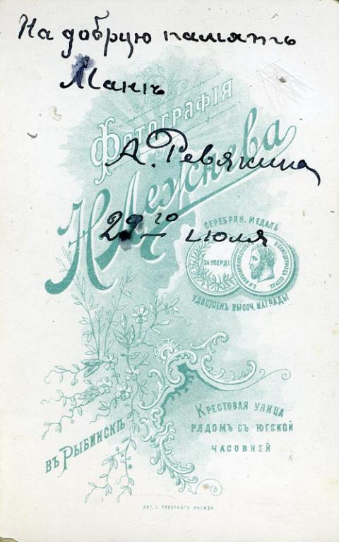 «На добрую память МанѣА. Ревякина29 го іюля»