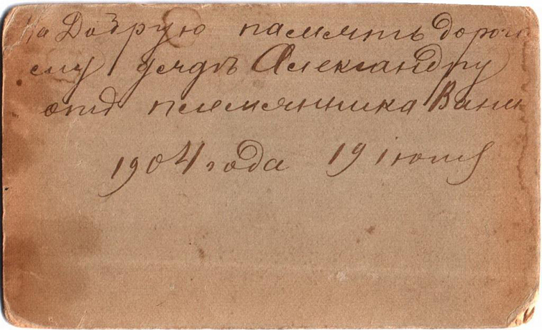 «На Добрую память дорогому дядѣ Александру отъ племянника Вани 1904 года 12 iюня»
