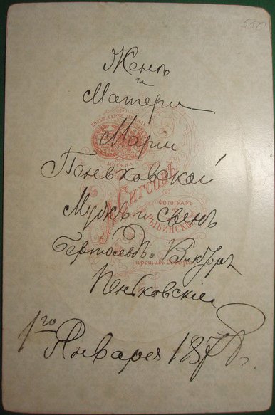 «Женѣ и Матери Марiи Пеньковской Мужъ и сынъ Бертольдъ и Викторъ Пеньковскiе 1го Января 1878 г.»